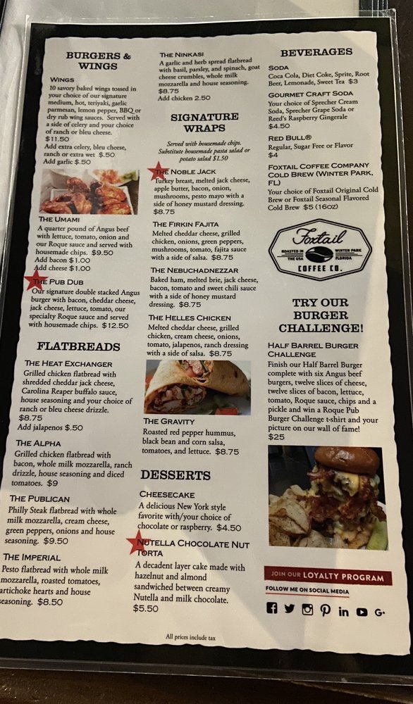 Roque Pub, a gem in Orlando, offers a unique New American dining experience. With a diverse menu featuring artisan cheese boards, flavorful salads like The Beta Salad and The Cold Break Salad, and signature wraps like The Firkin Fajita Wrap, Roque Pub caters to all taste buds. The cozy pub boasts a relaxed atmosphere with pool tables, dart boards, live music, and events like trivia nights. Customers rave about the friendly staff and extensive beer selection. The Bulkhead sandwich stands out as a favorite, with its corned beef and roast beef combination drenched in Roque sauce. Whether you're looking for a casual hangout spot or a delicious meal, Roque Pub is the place to be. Experience the charm and exceptional dining options at this women-owned establishment. Cheers to good times at Roque Pub!